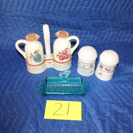 Lot 21 Kitchenware Oil Vinegar set, Disney Shakers, Butterfly Butterdish